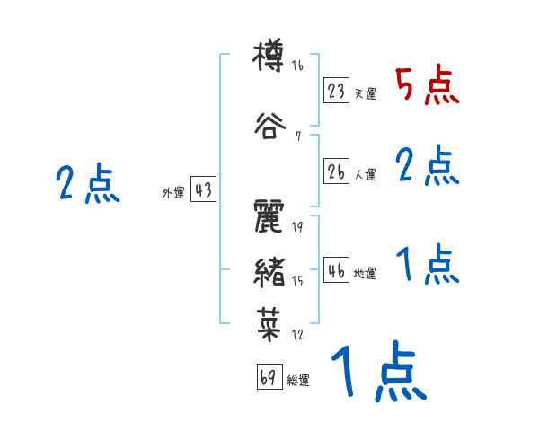 総運![]() | 樽谷麗緒菜さんの総運は69画の1つ星!不満を感じやすい傾向が。ストレスを貯めないように注意しましょう。 あなたの人生を表す1番重要な運勢です。生涯を通じて影響する総合運となり、主に50歳以降の晩年期に影響を及ぼします。 |