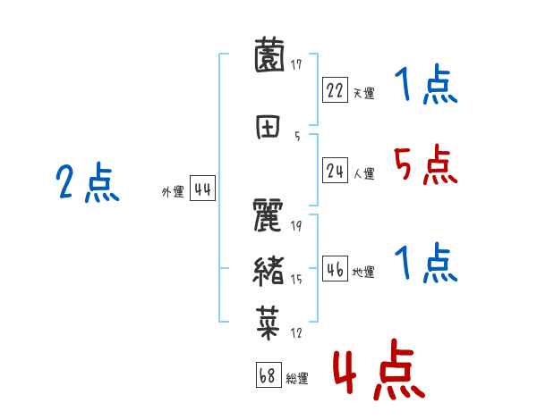 外運![]() | 薗田麗緒菜さんの外運は44画の2つ星!誠実で慎重な性格。物事を考えすぎないように注意しましょう。 生活面を象徴する運勢です。外部から受ける影響力を表し、結婚運、家庭運や職場、環境への順応性を表します。 |