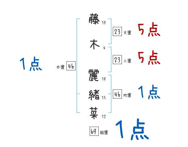 総運![]() | 藤木麗緒菜さんの総運は69画の1つ星!不満を感じやすい傾向が。ストレスを貯めないように注意しましょう。 あなたの人生を表す1番重要な運勢です。生涯を通じて影響する総合運となり、主に50歳以降の晩年期に影響を及ぼします。 |