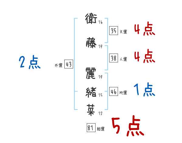 外運![]()  | 衛藤麗緒菜さんの外運は43画の2つ星!頑固な性格で独立心が強いかも。やや非現実的で浪費に注意しましょう。 生活面を象徴する運勢です。外部から受ける影響力を表し、結婚運、家庭運や職場、環境への順応性を表します。 |