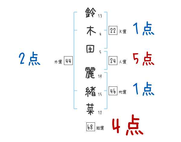 外運![]() | 鈴木田麗緒菜さんの外運は44画の2つ星!誠実で慎重な性格。物事を考えすぎないように注意しましょう。 生活面を象徴する運勢です。外部から受ける影響力を表し、結婚運、家庭運や職場、環境への順応性を表します。 |