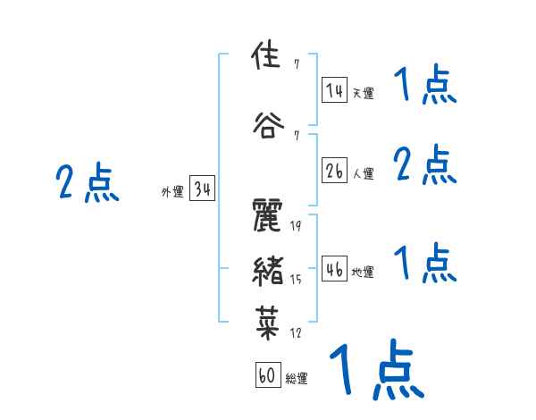 天運![]() | 住谷麗緒菜さんの天運は14画の1つ星!人に対して優しいがストレスを溜め込みがち。人間関係のトラブルを避けるよう気をつけましょう。 家系が持つ宿命的な運勢を表します。祖先から受け継いだ苗字ですので自分の力が及びません。家柄を象徴します。 |