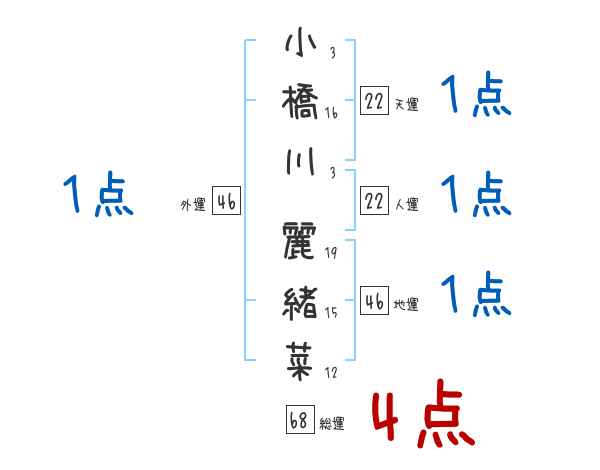 総運![]() | 小橋川麗緒菜さんの総運は68画の4つ星!潜在能力が高く集中力が高い。勤勉に励み発展する。 あなたの人生を表す1番重要な運勢です。生涯を通じて影響する総合運となり、主に50歳以降の晩年期に影響を及ぼします。 |