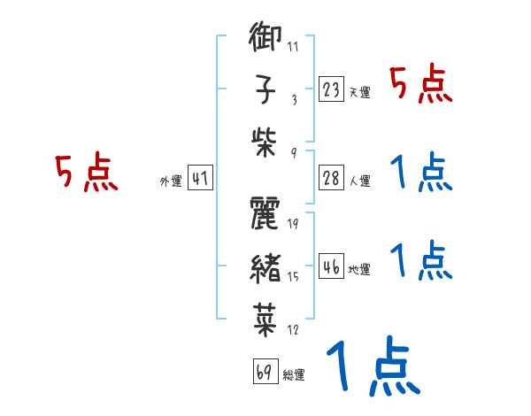 総運![]() | 御子柴麗緒菜さんの総運は69画の1つ星!不満を感じやすい傾向が。ストレスを貯めないように注意しましょう。 あなたの人生を表す1番重要な運勢です。生涯を通じて影響する総合運となり、主に50歳以降の晩年期に影響を及ぼします。 |