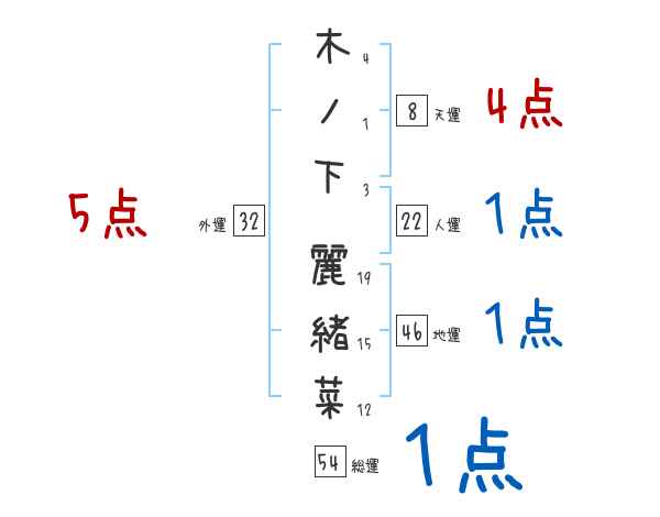 外運![]() | 木ノ下麗緒菜さんの外運は32画の5つ星!柔軟性があり成功する。チャンスが多く金運が良い。 生活面を象徴する運勢です。外部から受ける影響力を表し、結婚運、家庭運や職場、環境への順応性を表します。 |