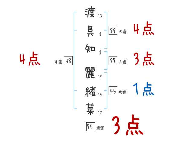 天運![]() | 渡具知麗緒菜さんの天運は29画の4つ星!完全主義で才能がある。厳格な心の持ち主。 家系が持つ宿命的な運勢を表します。祖先から受け継いだ苗字ですので自分の力が及びません。家柄を象徴します。 |