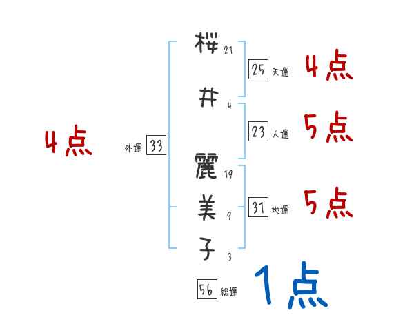 天運![]() | 桜井麗美子さんの天運は25画の4つ星!個性があり才能があふれる。強運の持ち主で発展する。 家系が持つ宿命的な運勢を表します。祖先から受け継いだ苗字ですので自分の力が及びません。家柄を象徴します。 |