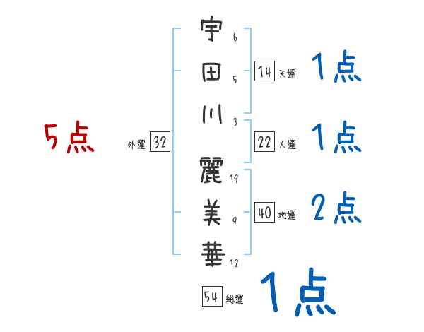 外運![]() | 宇田川麗美華さんの外運は32画の5つ星!柔軟性があり成功する。チャンスが多く金運が良い。 生活面を象徴する運勢です。外部から受ける影響力を表し、結婚運、家庭運や職場、環境への順応性を表します。 |