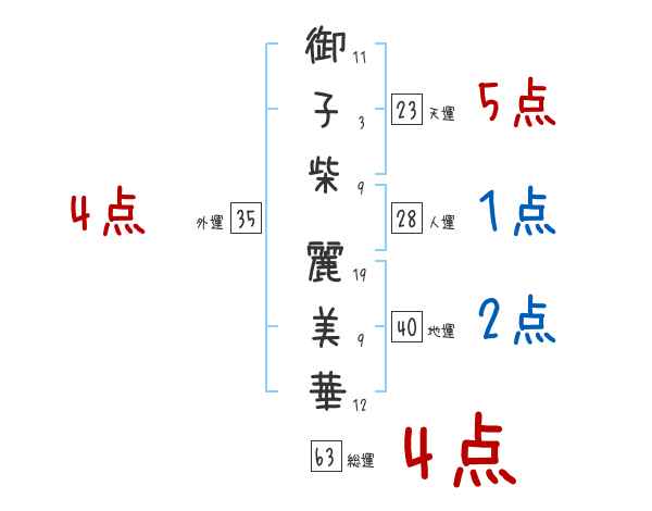 外運![]() | 御子柴麗美華さんの外運は35画の4つ星!温厚な性格で感受性が高い。穏和な性格で人望が厚い。 生活面を象徴する運勢です。外部から受ける影響力を表し、結婚運、家庭運や職場、環境への順応性を表します。 |