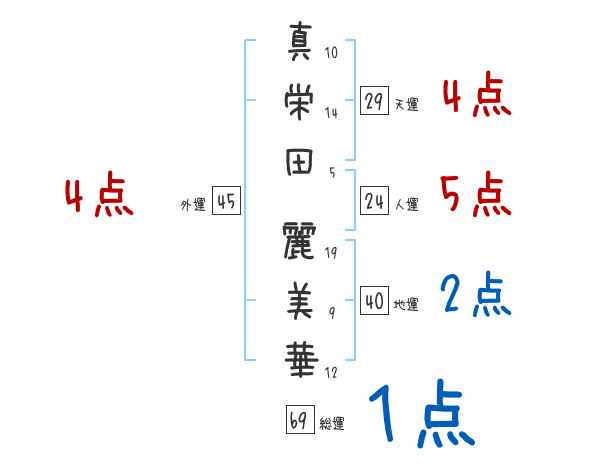 人運![]() | 真栄田麗美華さんの人運は24画の5つ星!家庭運が良く順調な人生。金運にも恵まれる。 性格や才能などを表す2番目に重要な運勢です。人間関係や協調性、社会的な成功に影響します。主に20歳から50歳ぐらいまでの中年期の運勢を表します。 |