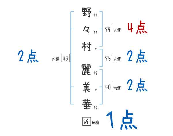天運![]()  | 野々村麗美華さんの天運は29画の4つ星!完全主義で才能がある。厳格な心の持ち主。 家系が持つ宿命的な運勢を表します。祖先から受け継いだ苗字ですので自分の力が及びません。家柄を象徴します。 |