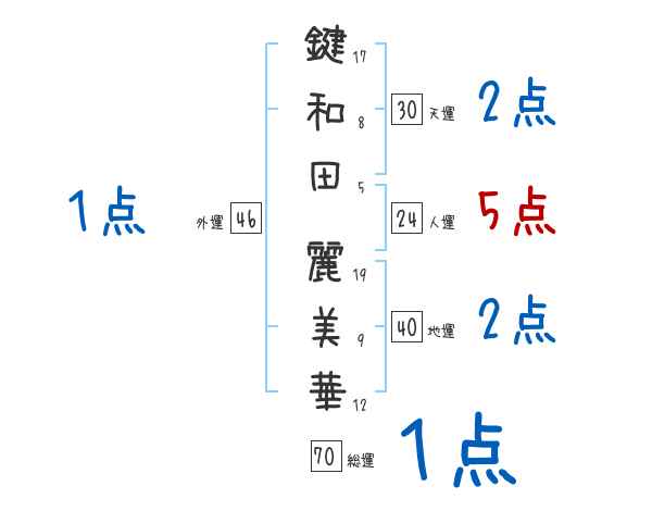 天運![]() | 鍵和田麗美華さんの天運は30画の2つ星!浮き沈みの激しさに注意しましょう。 家系が持つ宿命的な運勢を表します。祖先から受け継いだ苗字ですので自分の力が及びません。家柄を象徴します。 |