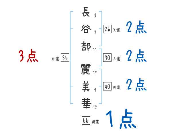 天運![]() | 長谷部麗美華さんの天運は26画の2つ星!波瀾万丈かも。信頼できる人を大事にしましょう。 家系が持つ宿命的な運勢を表します。祖先から受け継いだ苗字ですので自分の力が及びません。家柄を象徴します。 |