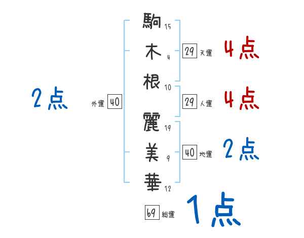 天運![]() | 駒木根麗美華さんの天運は29画の4つ星!完全主義で才能がある。厳格な心の持ち主。 家系が持つ宿命的な運勢を表します。祖先から受け継いだ苗字ですので自分の力が及びません。家柄を象徴します。 |