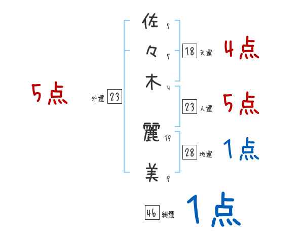 人運![]() | 佐々木麗美さんの人運は23画の5つ星!想像力に優れ活力がある。一代で成功し名誉を手に入れる。 性格や才能などを表す2番目に重要な運勢です。人間関係や協調性、社会的な成功に影響します。主に20歳から50歳ぐらいまでの中年期の運勢を表します。 |
