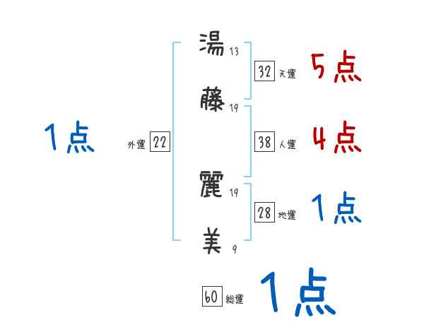 天運![]() | 湯藤麗美さんの天運は32画の5つ星!柔軟性があり成功する。チャンスが多く金運が良い。 家系が持つ宿命的な運勢を表します。祖先から受け継いだ苗字ですので自分の力が及びません。家柄を象徴します。 |
