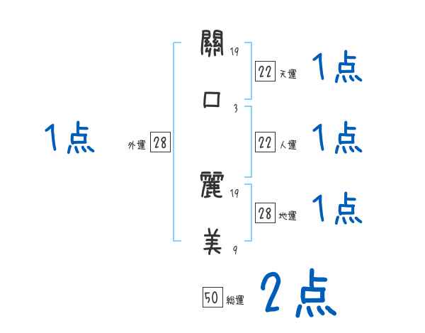 天運![]() | 關口麗美さんの天運は22画の1つ星!努力することが苦手ないっぽう手先が器用。芸術性にも優れる。 家系が持つ宿命的な運勢を表します。祖先から受け継いだ苗字ですので自分の力が及びません。家柄を象徴します。 |