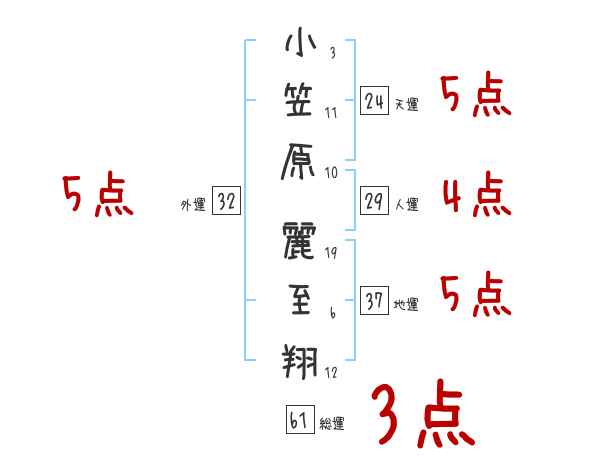 外運![]() | 小笠原麗至翔さんの外運は32画の5つ星!柔軟性があり成功する。チャンスが多く金運が良い。 生活面を象徴する運勢です。外部から受ける影響力を表し、結婚運、家庭運や職場、環境への順応性を表します。 |