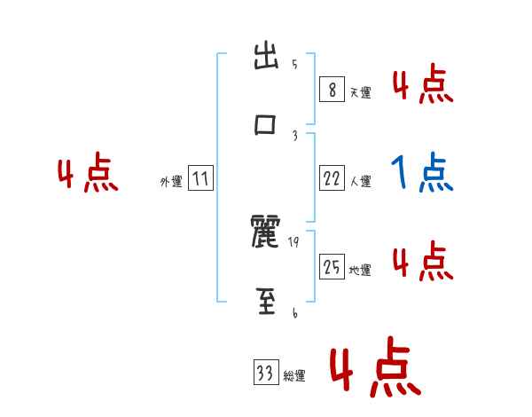 総運![]() | 出口麗至さんの総運は33画の4つ星!権力志向でプライドが高い。勇気があり運を切り開き成功する。 あなたの人生を表す1番重要な運勢です。生涯を通じて影響する総合運となり、主に50歳以降の晩年期に影響を及ぼします。 |