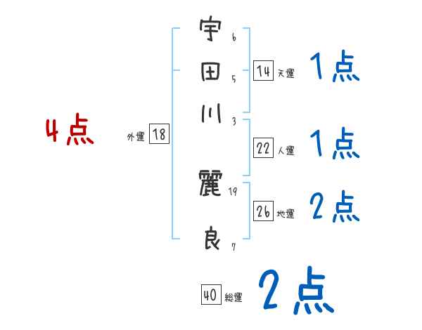 天運![]() | 宇田川麗良さんの天運は14画の1つ星!人に対して優しいがストレスを溜め込みがち。人間関係のトラブルを避けるよう気をつけましょう。 家系が持つ宿命的な運勢を表します。祖先から受け継いだ苗字ですので自分の力が及びません。家柄を象徴します。 |