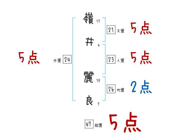 天運![]() | 嶺井麗良さんの天運は21画の5つ星!統率力がある。独立し成功する。名誉を手に入れる。 家系が持つ宿命的な運勢を表します。祖先から受け継いだ苗字ですので自分の力が及びません。家柄を象徴します。 |