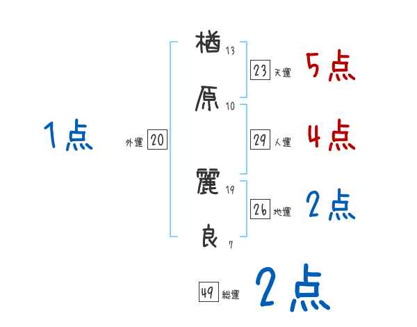 天運![]() | 楢原麗良さんの天運は23画の5つ星!想像力に優れ活力がある。一代で成功し名誉を手に入れる。 家系が持つ宿命的な運勢を表します。祖先から受け継いだ苗字ですので自分の力が及びません。家柄を象徴します。 |