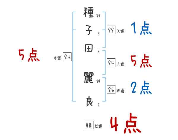 天運![]() | 種子田麗良さんの天運は22画の1つ星!努力することが苦手ないっぽう手先が器用。芸術性にも優れる。 家系が持つ宿命的な運勢を表します。祖先から受け継いだ苗字ですので自分の力が及びません。家柄を象徴します。 |