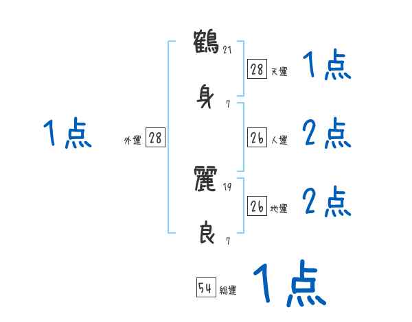 天運![]() | 鶴身麗良さんの天運は28画の1つ星!家庭環境に注意。スポーツで活躍できる能力があるかも。 家系が持つ宿命的な運勢を表します。祖先から受け継いだ苗字ですので自分の力が及びません。家柄を象徴します。 |