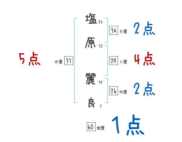 天運![]() | 塩原麗良さんの天運は34画の2つ星!独創性に優れるが、自尊心が強く災難に注意しましょう。 家系が持つ宿命的な運勢を表します。祖先から受け継いだ苗字ですので自分の力が及びません。家柄を象徴します。 |
