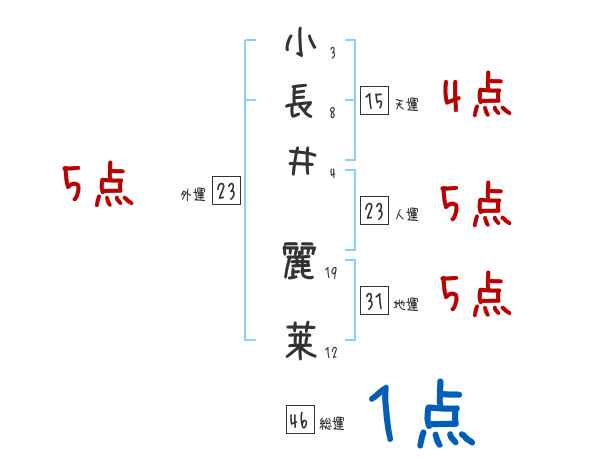 外運![]() | 小長井麗莱さんの外運は23画の5つ星!想像力に優れ活力がある。一代で成功し名誉を手に入れる。 生活面を象徴する運勢です。外部から受ける影響力を表し、結婚運、家庭運や職場、環境への順応性を表します。 |