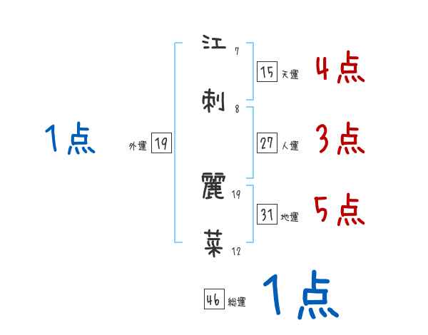 総運![]() | 江刺麗菜さんの総運は46画の1つ星!迷走することが多く苦労するかも。目先のことにとらわれないように。 あなたの人生を表す1番重要な運勢です。生涯を通じて影響する総合運となり、主に50歳以降の晩年期に影響を及ぼします。 |