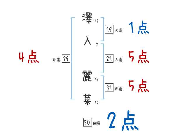 外運![]() | 澤入麗菜さんの外運は29画の4つ星!完全主義で才能がある。厳格な心の持ち主。 生活面を象徴する運勢です。外部から受ける影響力を表し、結婚運、家庭運や職場、環境への順応性を表します。 |