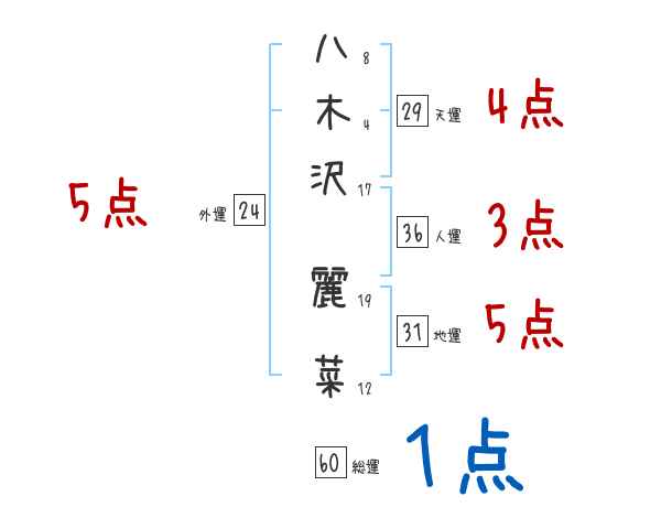 天運![]() | 八木沢麗菜さんの天運は29画の4つ星!完全主義で才能がある。厳格な心の持ち主。 家系が持つ宿命的な運勢を表します。祖先から受け継いだ苗字ですので自分の力が及びません。家柄を象徴します。 |