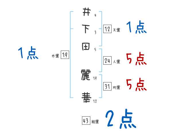 総運![]() | 井下田麗華さんの総運は43画の2つ星!頑固な性格で独立心が強いかも。やや非現実的で浪費に注意しましょう。 あなたの人生を表す1番重要な運勢です。生涯を通じて影響する総合運となり、主に50歳以降の晩年期に影響を及ぼします。 |