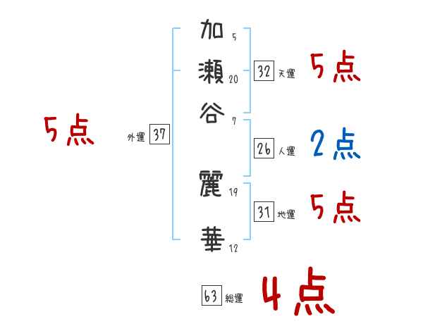 天運![]() | 加瀬谷麗華さんの天運は32画の5つ星!柔軟性があり成功する。チャンスが多く金運が良い。 家系が持つ宿命的な運勢を表します。祖先から受け継いだ苗字ですので自分の力が及びません。家柄を象徴します。 |