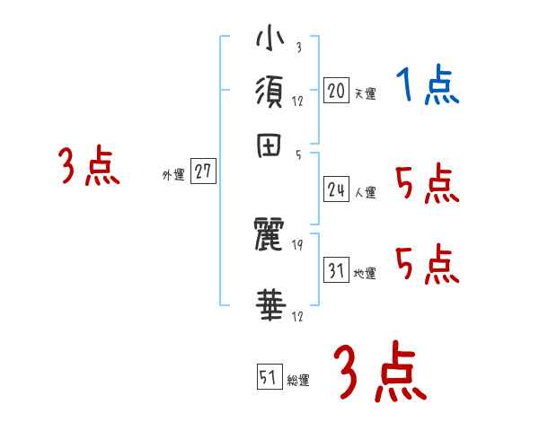 外運![]() | 小須田麗華さんの外運は27画の3つ星!頭脳明晰だが強情で摩擦が多い傾向。孤立に注意。 生活面を象徴する運勢です。外部から受ける影響力を表し、結婚運、家庭運や職場、環境への順応性を表します。 |