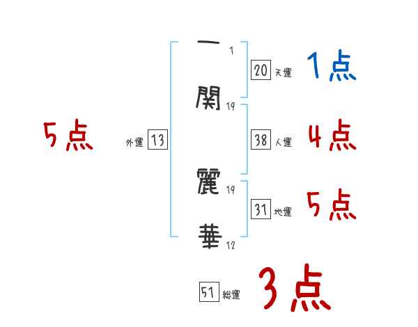 外運![]() | 一関麗華さんの外運は13画の5つ星!才能に恵まれ人気がある。名声を手に入れる。円満な人生。 生活面を象徴する運勢です。外部から受ける影響力を表し、結婚運、家庭運や職場、環境への順応性を表します。 |