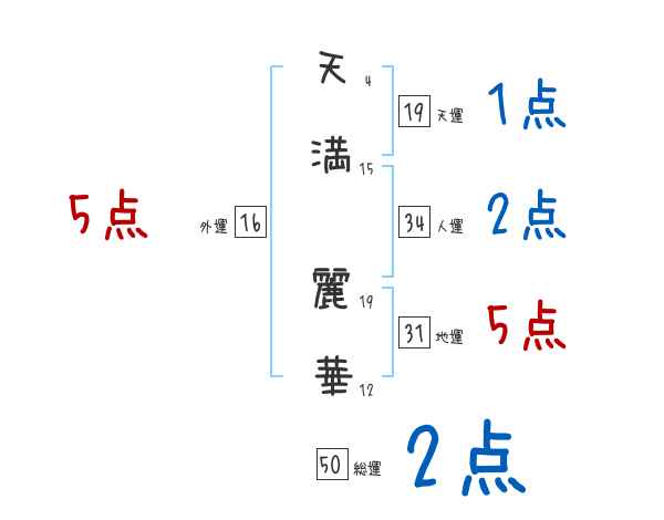 天運![]() | 天満麗華さんの天運は19画の1つ星!優れた才能を持ちますが、協調性が足りないことも。周りの人と協力する事を意識しましょう。 家系が持つ宿命的な運勢を表します。祖先から受け継いだ苗字ですので自分の力が及びません。家柄を象徴します。 |