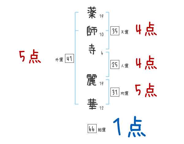 天運![]() | 薬師寺麗華さんの天運は35画の4つ星!温厚な性格で感受性が高い。穏和な性格で人望が厚い。 家系が持つ宿命的な運勢を表します。祖先から受け継いだ苗字ですので自分の力が及びません。家柄を象徴します。 |