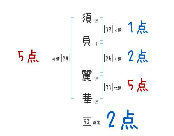 外運![]() | 須貝麗華さんの外運は24画の5つ星!家庭運が良く順調な人生。金運にも恵まれる。 生活面を象徴する運勢です。外部から受ける影響力を表し、結婚運、家庭運や職場、環境への順応性を表します。 |