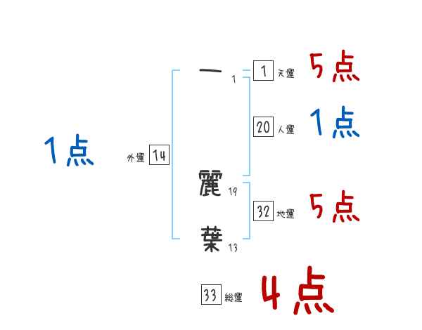 天運![]() | 一麗葉さんの天運は1画の5つ星!行動力、指導力があり出世し繁栄する。幸運に恵まれる。 家系が持つ宿命的な運勢を表します。祖先から受け継いだ苗字ですので自分の力が及びません。家柄を象徴します。 |