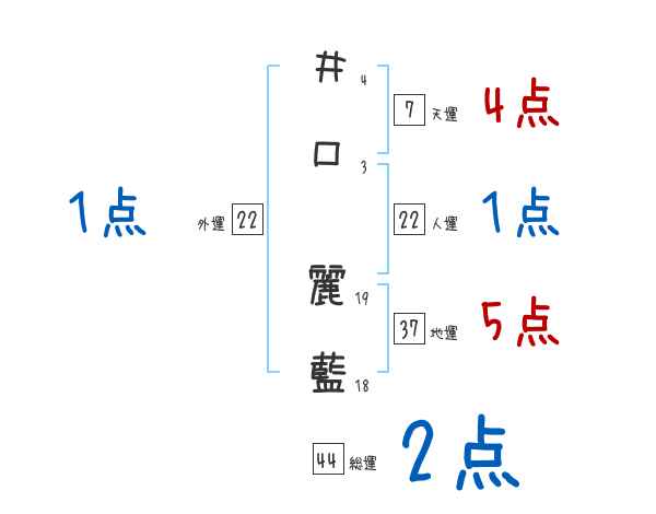 総運![]() | 井口麗藍さんの総運は44画の2つ星!誠実で慎重な性格。物事を考えすぎないように注意しましょう。 あなたの人生を表す1番重要な運勢です。生涯を通じて影響する総合運となり、主に50歳以降の晩年期に影響を及ぼします。 |