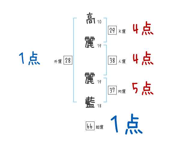 外運![]() | 高麗麗藍さんの外運は28画の1つ星!家庭環境に注意。スポーツで活躍できる能力があるかも。 生活面を象徴する運勢です。外部から受ける影響力を表し、結婚運、家庭運や職場、環境への順応性を表します。 |