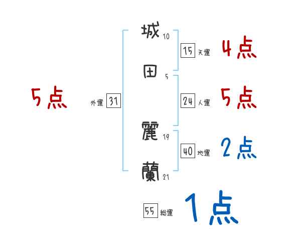 人運![]() | 城田麗蘭さんの人運は24画の5つ星!家庭運が良く順調な人生。金運にも恵まれる。 性格や才能などを表す2番目に重要な運勢です。人間関係や協調性、社会的な成功に影響します。主に20歳から50歳ぐらいまでの中年期の運勢を表します。 |