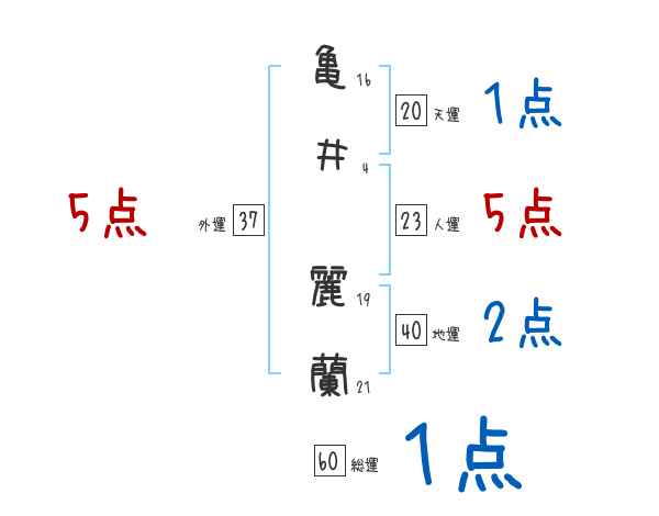 人運![]() | 亀井麗蘭さんの人運は23画の5つ星!想像力に優れ活力がある。一代で成功し名誉を手に入れる。 性格や才能などを表す2番目に重要な運勢です。人間関係や協調性、社会的な成功に影響します。主に20歳から50歳ぐらいまでの中年期の運勢を表します。 |