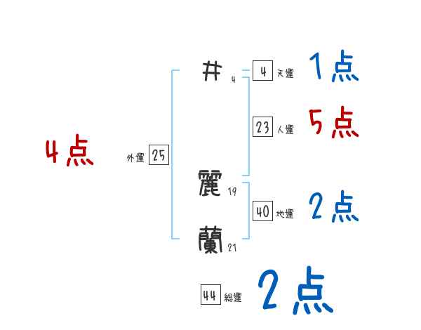 総運![]() | 井麗蘭さんの総運は44画の2つ星!誠実で慎重な性格。物事を考えすぎないように注意しましょう。 あなたの人生を表す1番重要な運勢です。生涯を通じて影響する総合運となり、主に50歳以降の晩年期に影響を及ぼします。 |