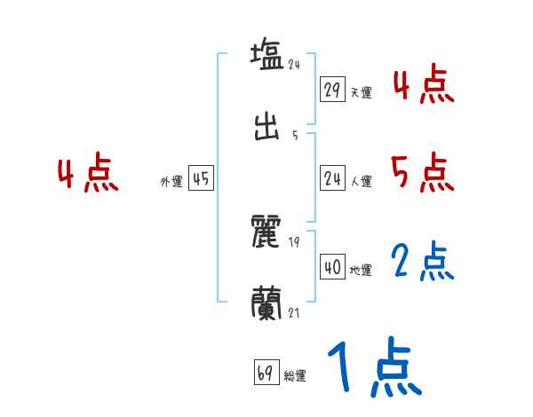 人運![]() | 塩出麗蘭さんの人運は24画の5つ星!家庭運が良く順調な人生。金運にも恵まれる。 性格や才能などを表す2番目に重要な運勢です。人間関係や協調性、社会的な成功に影響します。主に20歳から50歳ぐらいまでの中年期の運勢を表します。 |
