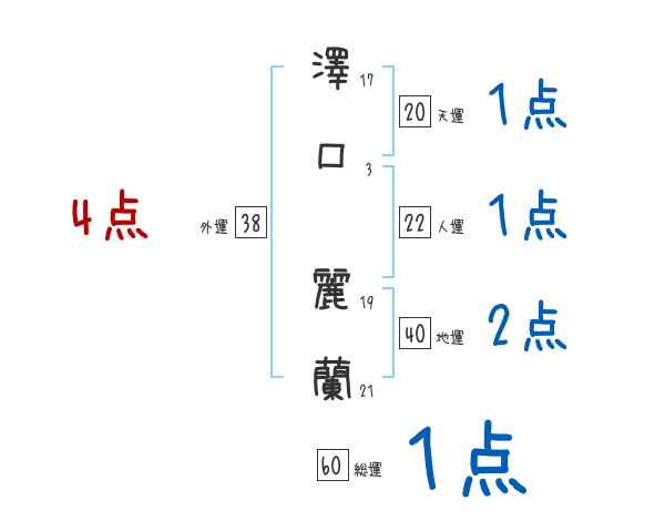 外運![]() | 澤口麗蘭さんの外運は38画の4つ星!温厚な性格で技術的な才能を発揮する。職人的な仕事に向いている。 生活面を象徴する運勢です。外部から受ける影響力を表し、結婚運、家庭運や職場、環境への順応性を表します。 |