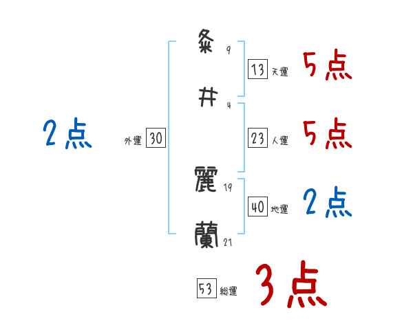 総運![]() | 粂井麗蘭さんの総運は53画の3つ星!やや見栄っ張りで虚栄心がある。散財に注意。 あなたの人生を表す1番重要な運勢です。生涯を通じて影響する総合運となり、主に50歳以降の晩年期に影響を及ぼします。 |