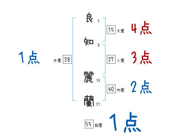 天運![]() | 良知麗蘭さんの天運は15画の4つ星!人徳があり出世する。順調に物事を進め円満な人生。 家系が持つ宿命的な運勢を表します。祖先から受け継いだ苗字ですので自分の力が及びません。家柄を象徴します。 |